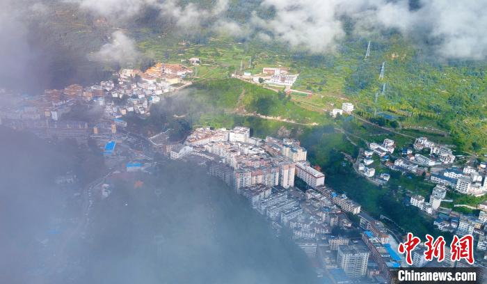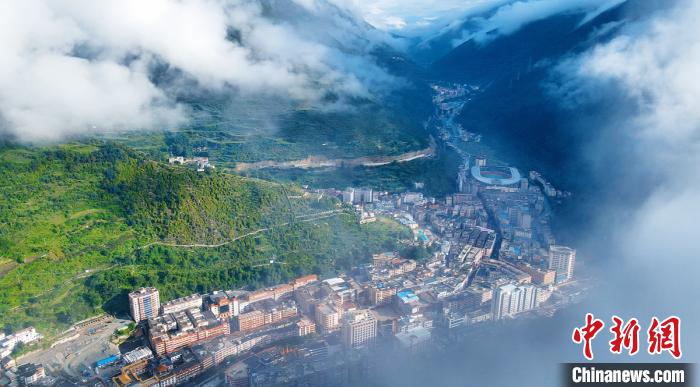 空中俯瞰云霧下的康定老城全景?!⒅铱 z