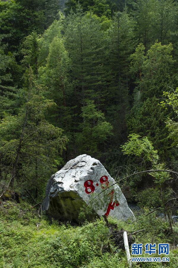 這是九寨溝風(fēng)景名勝區(qū)內(nèi)的“8·8石”(6月18日攝)。地震中,這塊高約9.2米、重約522噸的巨石從海拔2654米的山體滾落至河谷,垂直落差達(dá)272米。此石為白云質(zhì)灰?guī)r,形成于3.2億年前的海洋環(huán)境,見證了九寨溝的滄桑變遷。新華社記者 沈伯韓 攝