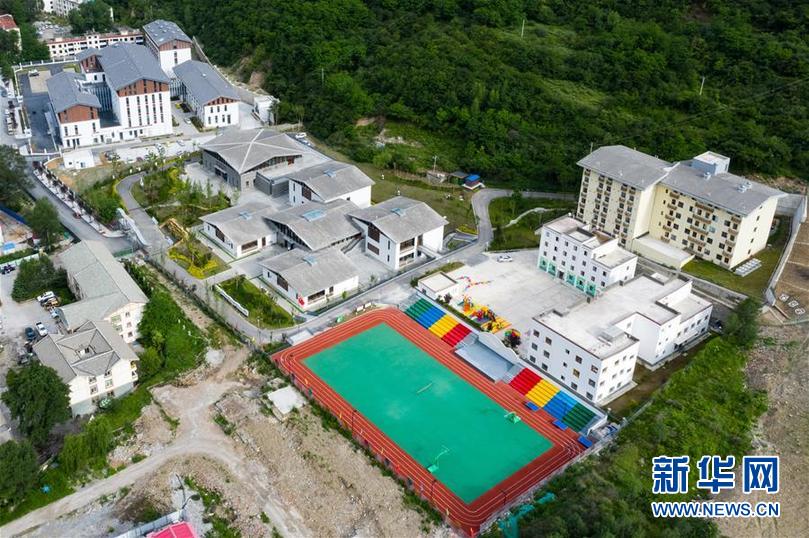 這是四川省阿壩藏族羌族自治州九寨溝縣九寨溝小學(xué)(原漳扎鎮(zhèn)小學(xué))和九寨溝縣第二人民醫(yī)院(后)(無人機(jī)照片,6月18日攝)。 新華社記者 沈伯韓 攝