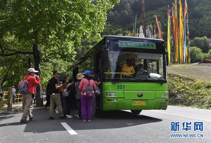 游客在九寨溝景區(qū)內(nèi)乘坐觀光車(6月18日攝)。新華社記者 劉坤 攝