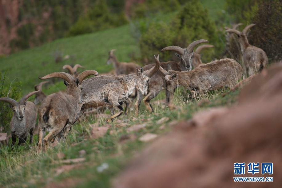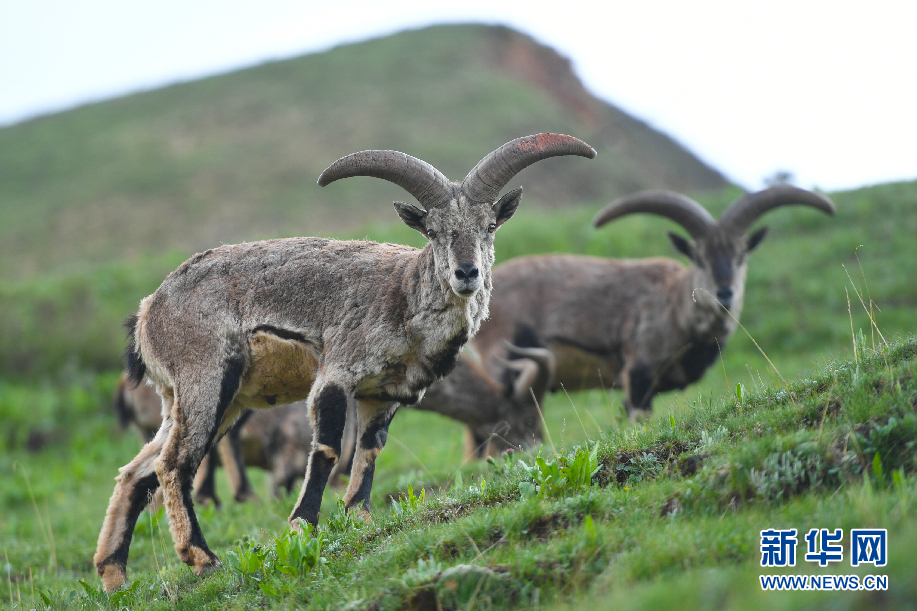 三只巖羊在囊謙縣吉尼賽鄉(xiāng)河谷的山坡上覓食。(6月20日攝)新華網(wǎng) 潘彬彬 攝