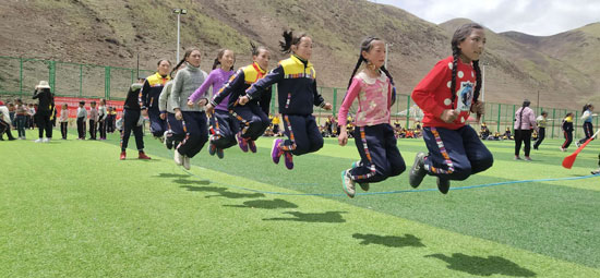新修的操場是他“套路”到的,400米的標(biāo)準(zhǔn)跑道,比縣里小學(xué)的那個還好。這原本是鄉(xiāng)里的文體設(shè)施,班瑪多杰軟磨硬泡,央求著領(lǐng)導(dǎo)批準(zhǔn),把這個操場修到了學(xué)校旁邊?!傲弧敝螅粓鲞\(yùn)動會就在這個操場上舉辦了。跑步,拔河,跳遠(yuǎn)……
