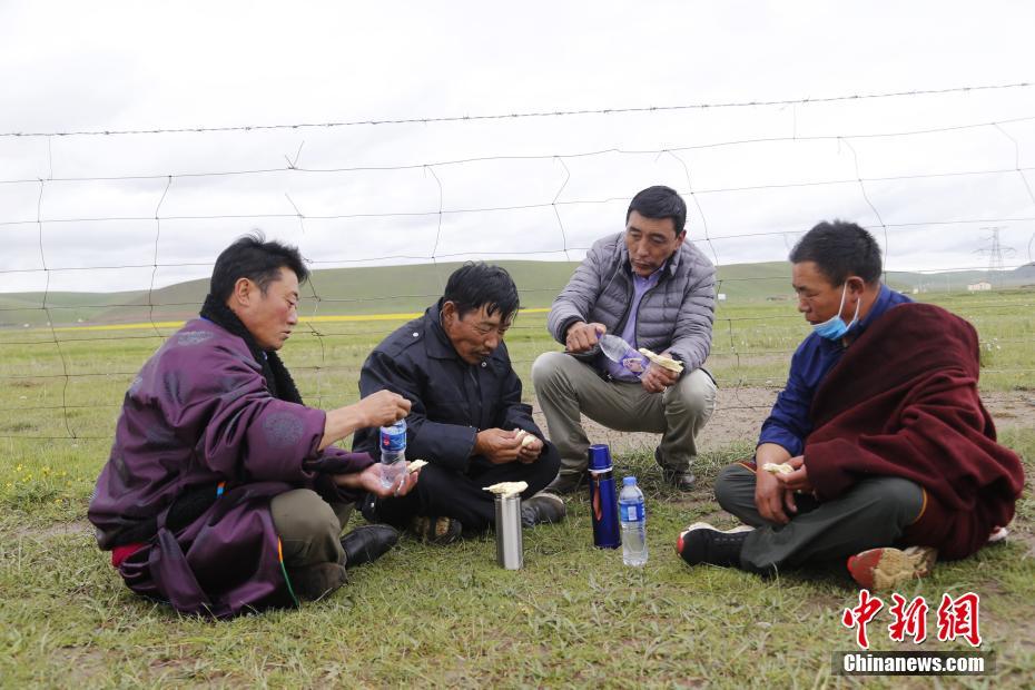 7月21日,青海省海北藏族自治州剛察縣伊克烏蘭鄉(xiāng)剛察貢麻村的索南木旦巴(左一)、仁增才讓(左二)、吉科加(右二)、萬瑪扎西(右一)四人在撿拾著草場垃圾途中,吃餅子,喝礦泉水充饑。2008年,萬瑪扎西路在村支書的支持下,與索南木旦巴、仁增才讓、吉科加三個(gè)人組建了義務(wù)環(huán)保隊(duì),自此一干就是12年。他們在撿拾垃圾的同時(shí)進(jìn)行著環(huán)保宣傳,希望從源頭減少垃圾。仁增才讓說:“現(xiàn)在草原上的垃圾幾乎是看不到了?!敝行律缬浾?馬銘言 攝