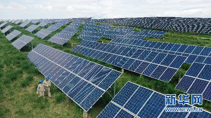 7月8日,在青海省海南藏族自治州共和縣,大唐青海公司新能源分公司兩名工作人員在光伏電站內(nèi)巡檢(無人機照片)。新華社記者 張宏祥 攝