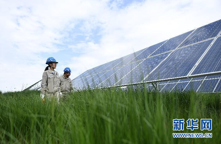 7月8日,在青海省海南藏族自治州共和縣,大唐青海公司新能源分公司兩名工作人員在光伏電站內(nèi)巡檢。新華社記者 張宏祥 攝