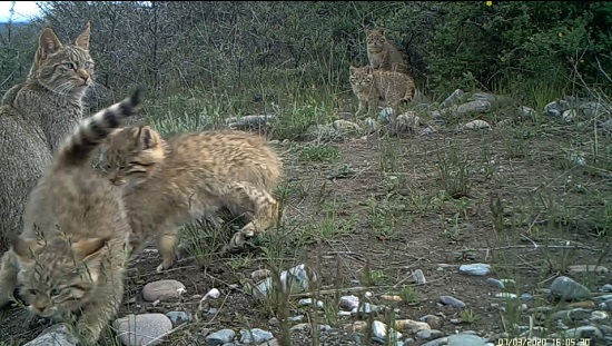 荒漠貓為中國所有貓科動物中僅有的特有物種,《世界自然保護聯(lián)盟》(IUCN)瀕危(EN)物種,荒漠貓在全國數(shù)量稀少,分布密度低,對其生活史所知甚少。其通常棲息于海拔2500米至5000米干燥的高山與亞高山灌叢、戈壁、草甸生境中。自祁連山國家公園青海省管理局啟動荒漠貓專項調查以來,在國家公園范圍內頻繁記錄到荒漠貓活動畫面,并且記錄到一只雌性荒漠貓成功撫育4只幼崽的畫面,監(jiān)測到5只荒漠貓同框的罕見畫面。祁連山國家公園青海片區(qū)自開展貓科動物專項調查以來,記錄到5只雪豹同框、6只兔猻同框的罕見畫面后又一次記錄到貓科動物多只同框的畫面。