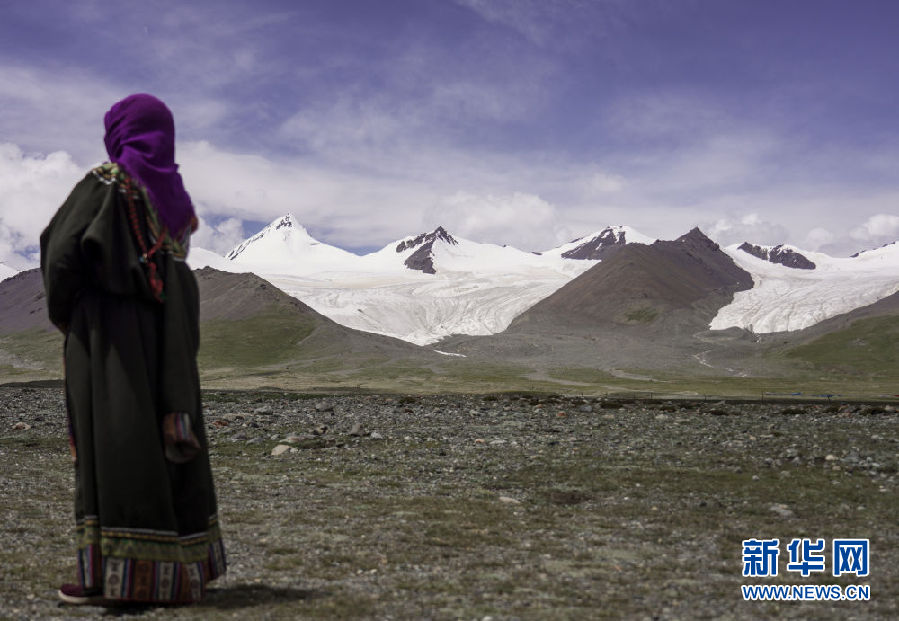 8月15日,牧民在雪山腳下遠(yuǎn)眺崗加曲巴冰川。新華社記者 吳剛 攝