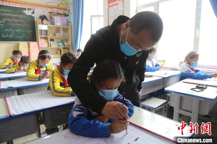 “排好隊(duì),我們要量體溫了。”教室外,完么仁增蹲在椅子旁,用手持紅外線測(cè)溫儀挨個(gè)兒為孩子們測(cè)量體溫并逐一登記,起身時(shí)他有點(diǎn)吃力,“這是我?guī)У牡?8屆學(xué)生?!彼f。