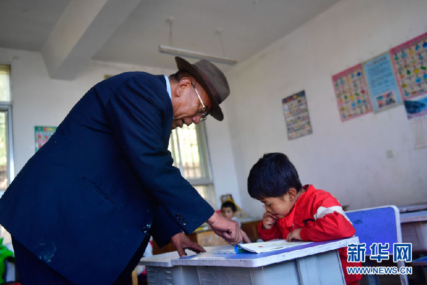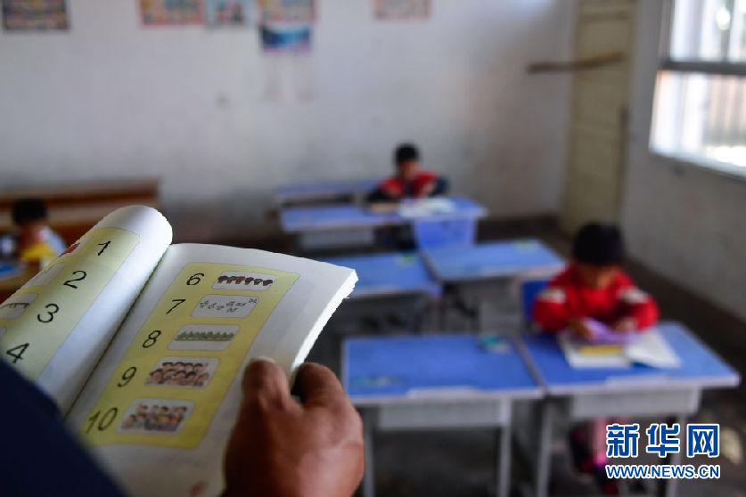 8月31日,在來塘村學(xué)校,完么仁增老師在指導(dǎo)一年級(jí)學(xué)生馬文輝學(xué)習(xí)。新華社記者 張龍 攝
