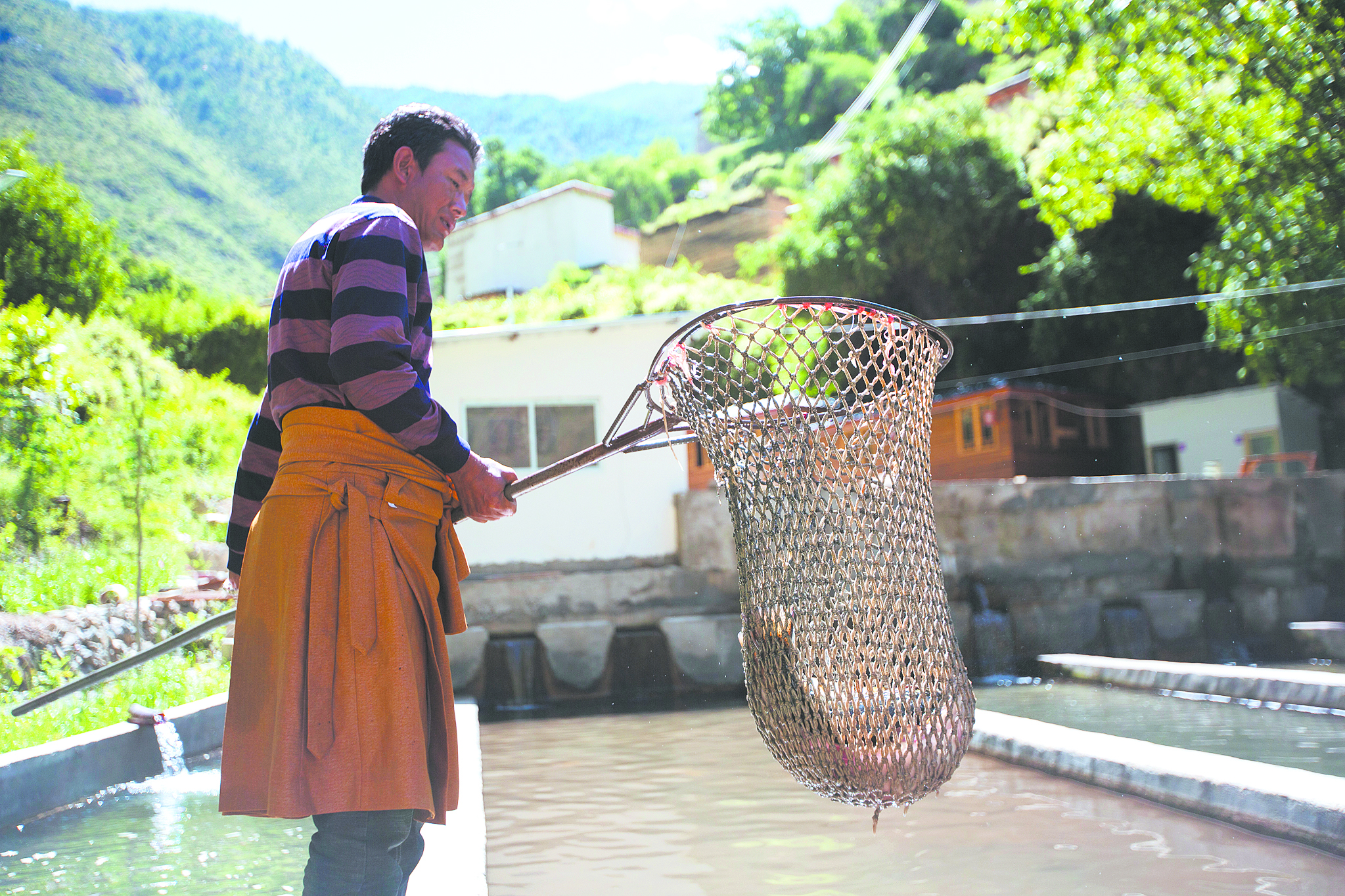 在成品魚(yú)池前,38歲的藏族老鄉(xiāng)彭錯(cuò)正拿著網(wǎng)兜撈魚(yú)。今天有買(mǎi)家來(lái)看魚(yú),他負(fù)責(zé)撈幾條樣品給人看。用攔截網(wǎng)片把魚(yú)群逼到狹窄的水道內(nèi),彭錯(cuò)熟練地拿起網(wǎng)兜在水中一攪,兩條肥碩的裂腹魚(yú)從水塘中一躍而起,褐色的鱗片在陽(yáng)光下閃閃發(fā)光。彭錯(cuò)不慌不忙,牢牢把住網(wǎng)兜左右一揮,兩條大魚(yú)便被捕入網(wǎng)中。“至少有三四斤重,肉質(zhì)緊實(shí),品質(zhì)很不錯(cuò)!”趕來(lái)查看的買(mǎi)家一邊抓魚(yú)一邊夸贊。