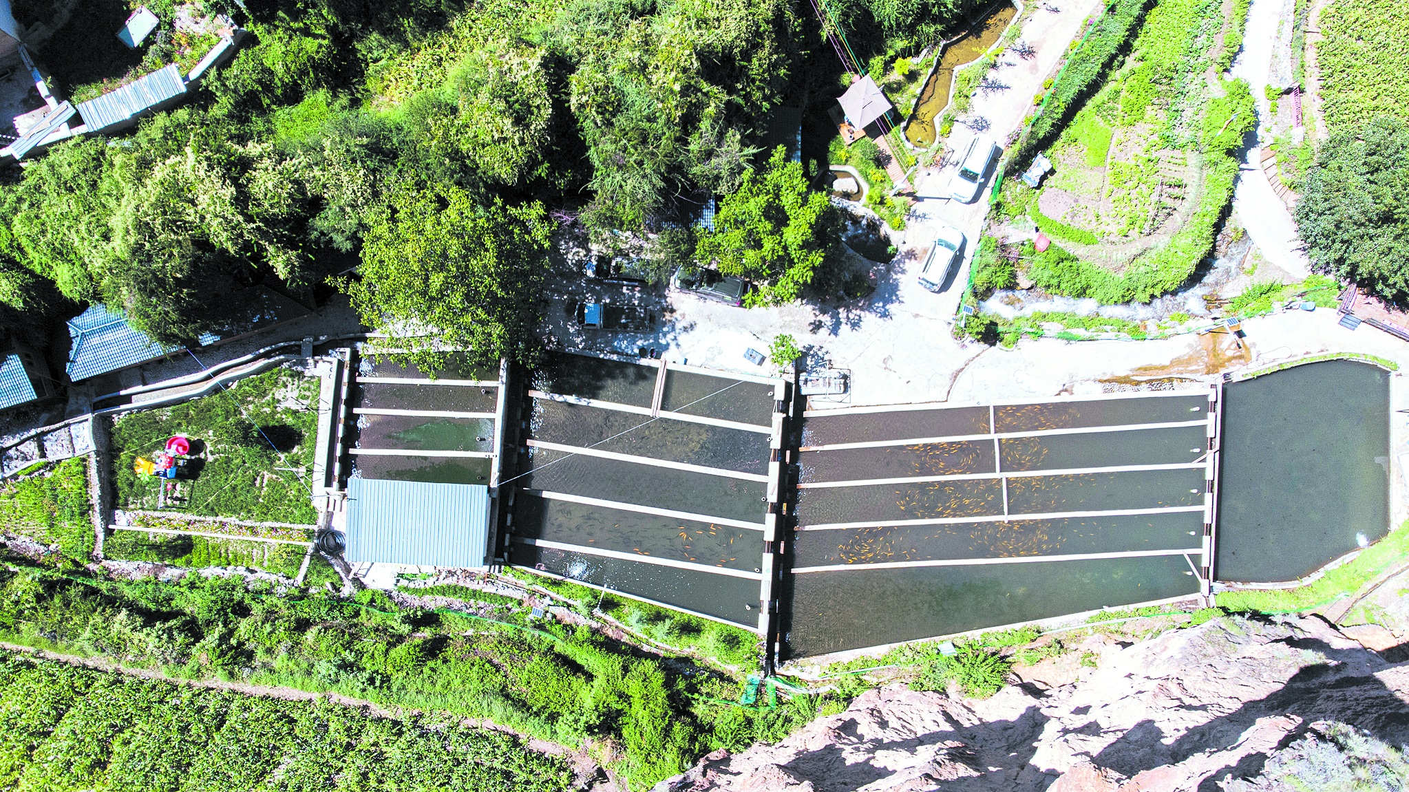 采訪車(chē)沿215國(guó)道在山谷間蜿蜒,定曲河水碧藍(lán)清亮。從莫木溝一路翻山而上,快到山頂時(shí),一座高山冷水魚(yú)養(yǎng)殖魚(yú)場(chǎng)呈現(xiàn)眼前。