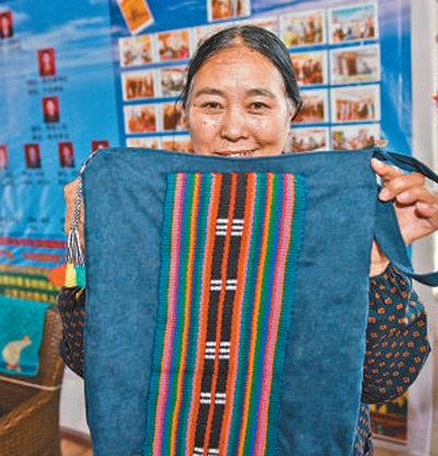 格爾木市長江源村崗巴布民族手工藝品專業(yè)合作社的社員展示制作的工藝品。攝于2020年5月。新華社記者 吳 剛攝