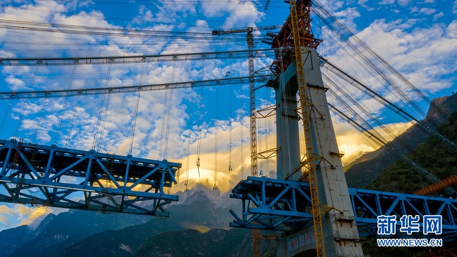正在吊裝最后一片鋼桁梁的麗香鐵路金沙江特大橋(10月13日攝)。新華網(wǎng) 陳暢 攝
