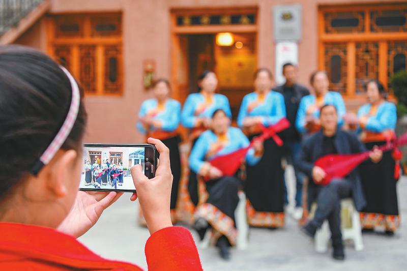九寨溝縣郭元鄉(xiāng)青龍村村民用土琵琶彈唱《十唱柴門關(guān)》歌謠,吸引游客拍照。蘇楊 攝