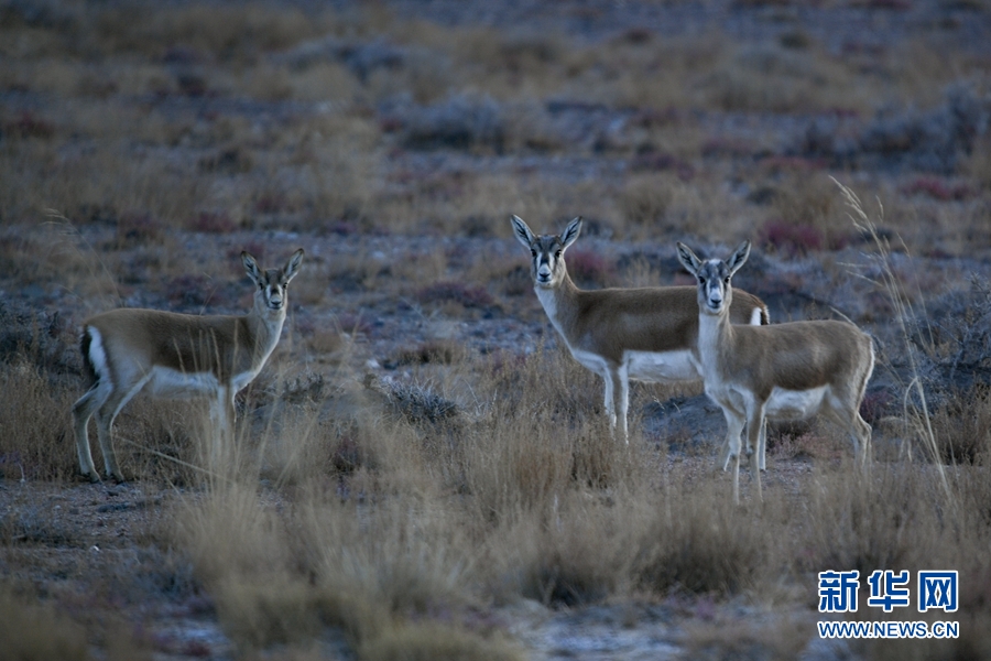 四只鵝喉羚在都蘭湖國家濕地公園內活動。(11月21日攝)新華網(wǎng) 潘彬彬 攝