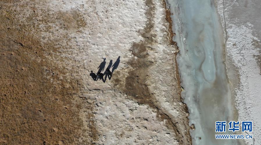 12月7日,站長(zhǎng)趙新錄(中)與隊(duì)友鄧海平(左)、達(dá)才在可可西里索南達(dá)杰保護(hù)站管護(hù)區(qū)域內(nèi)巡查(無(wú)人機(jī)照片)。新華社記者 王艷 攝