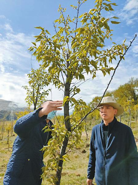 爐霍縣林草局技術人員檢查杏樹病蟲害情況。(爐霍縣林草局供圖)