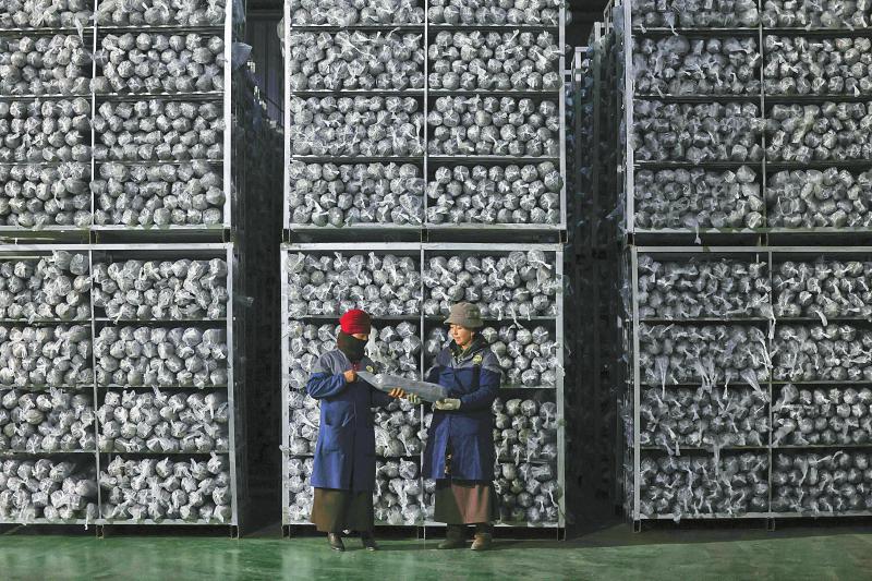 1月4日,松茸產業(yè)園的管理人員在倉庫里整理即將發(fā)放給當?shù)胤N植戶的滑子菇菌包。尹鋼 攝