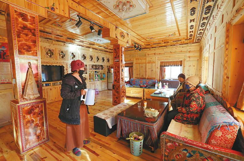八角樓鄉(xiāng)帕姆林村的白馬翁姆(左)是產業(yè)園的接種工,每月收入4000元。1月5日,她在新家客廳接待外地來的客人。尹鋼 攝