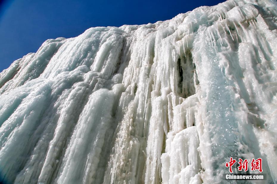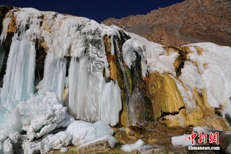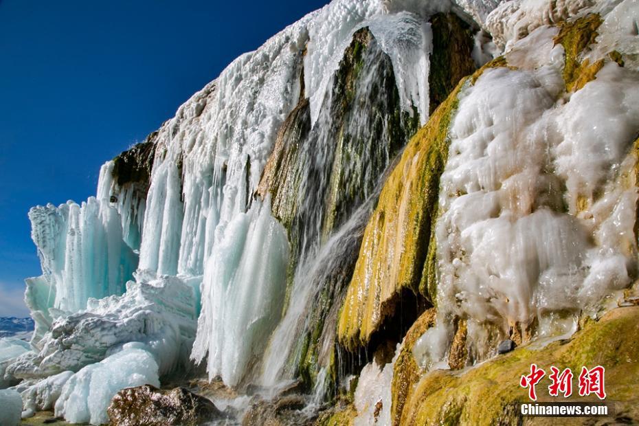 2021年1月23日,祁連山國(guó)家公園崗什卡雪峰山腳下的七彩冰瀑,由于溪水中含有多種礦物質(zhì),在冬日暖陽(yáng)的照耀下,散發(fā)出五彩繽紛的綺麗風(fēng)光,蔚為壯觀。中新社發(fā) 成 林 攝