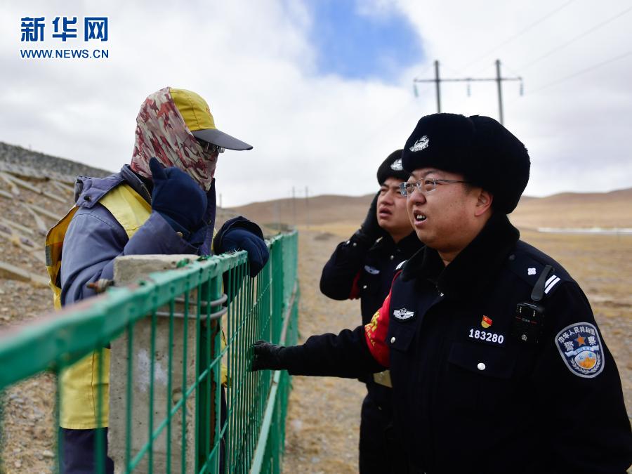 2月4日,沱沱河站派出所巡線民警田長松(右)在巡線途中向青藏鐵路公司格爾木工務(wù)段唐古拉線路車間養(yǎng)路工人了解情況。新華社記者 張龍 攝