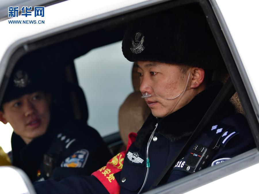 2月5日,沱沱河站派出所副所長蒲海春(右)在巡線途中出現(xiàn)高原反應(yīng)后緊急吸氧。新華社記者 張龍 攝