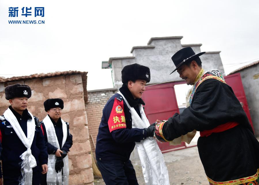 2月5日,沱沱河站派出所巡線民警到格爾木市唐古拉山鎮(zhèn)格日村義務(wù)護(hù)路隊(duì)員革命花(右一)家中慰問時接受哈達(dá)。新華社記者 張龍 攝