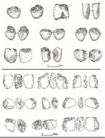 石核—石片技術(shù)是人類最早發(fā)明和使用的打制石器技術(shù),在我國距今兩百多萬年至一萬年左右舊石器時(shí)代有較為豐富的發(fā)現(xiàn)。它是用一件堅(jiān)硬圓鈍的石塊(石錘)打擊另一件石塊(石核)的邊緣,在石核邊緣剝離下帶有鋒利刃緣的片狀坯材(石片)。石核—石片工業(yè)的石核剝片模式可以有多種分類方式,如按臺(tái)面數(shù)量可以分為單臺(tái)面石核、雙臺(tái)面石核與多臺(tái)面石核;按剝片面數(shù)量可以分為單面剝片、雙面剝片、多面剝片與盤狀石核剝片等。
