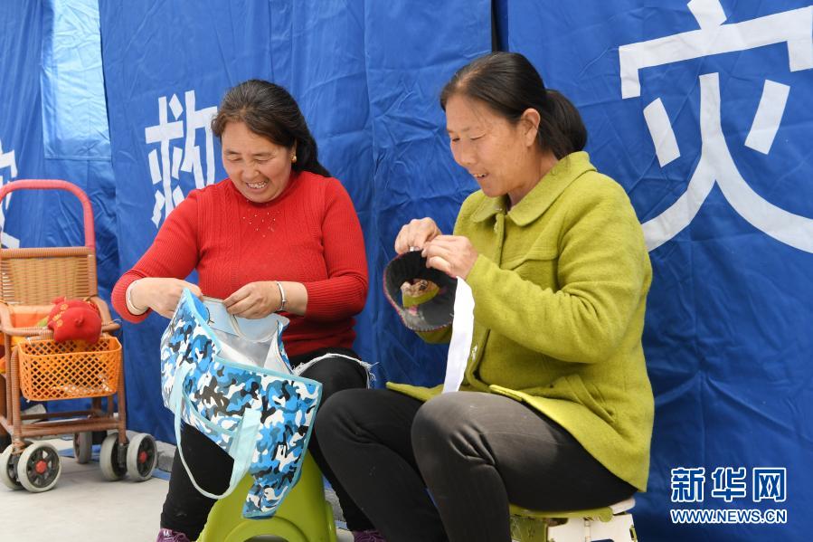 3月16日,在舟曲縣果耶鎮(zhèn)磨里村、果耶村滑坡災(zāi)害應(yīng)急避險(xiǎn)臨時(shí)安置點(diǎn),受災(zāi)群眾在帳篷外做針線。新華社記者 范培珅 攝