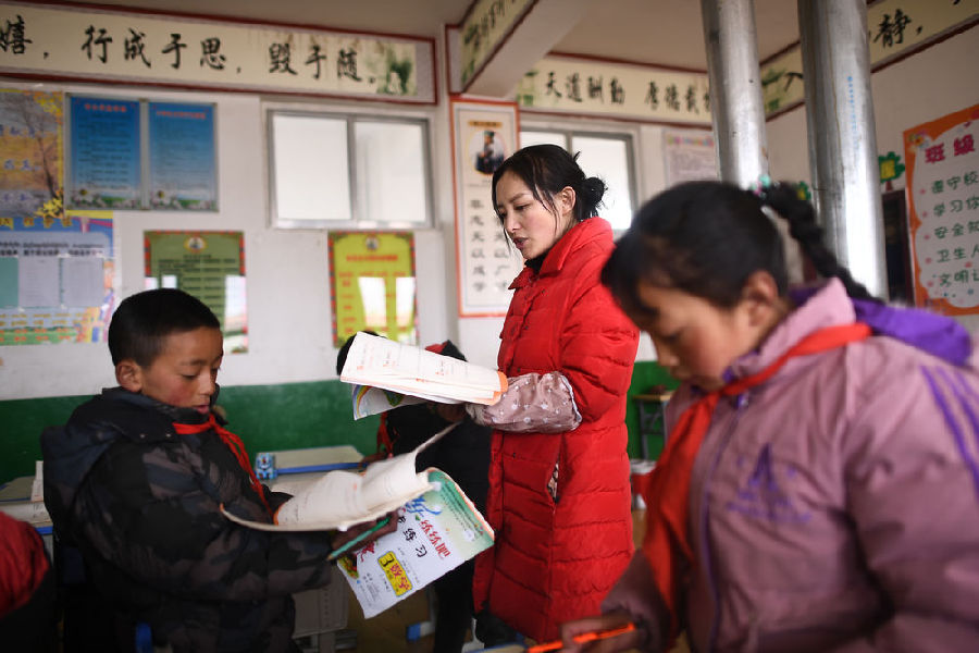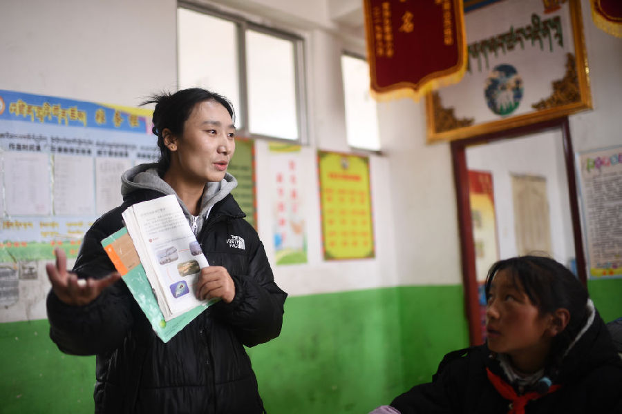 3月16日,索加鄉(xiāng)寄宿小學(xué)藏語文老師白瑪在為學(xué)生授課。新華社記者 韓方方 攝