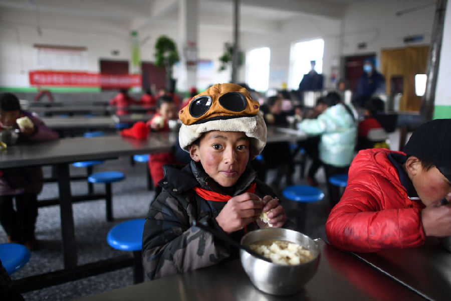 3月16日,在索加鄉(xiāng)寄宿小學(xué)食堂,格來達(dá)杰(前)在吃晚餐。新華社記者 韓方方 攝