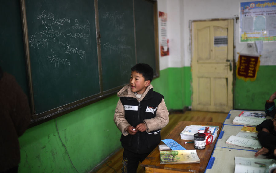 3月16日,索加鄉(xiāng)寄宿小學(xué)語文老師查日在為學(xué)生上課。新華社記者 張宏祥 攝