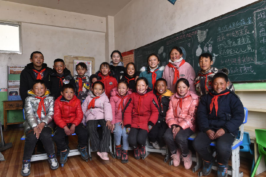 3月16日,在索加鄉(xiāng)寄宿小學(xué),達(dá)哇才吉老師(后排中)和學(xué)生在一起。新華社記者 韓方方 攝