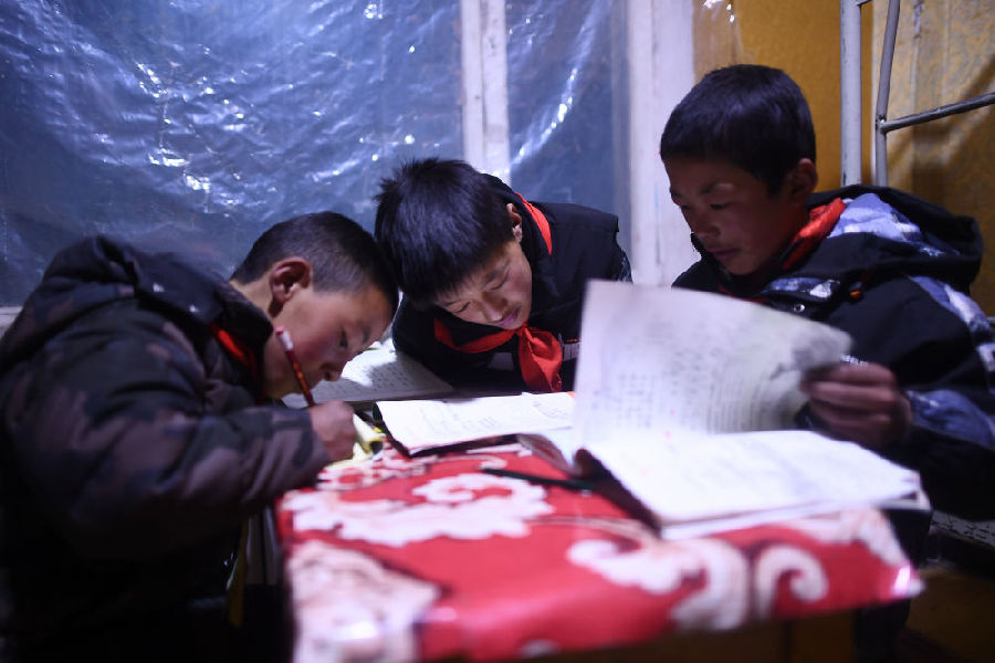 3月16日,在索加鄉(xiāng)寄宿小學(xué),羅松東丁(中)和小伙伴在宿舍內(nèi)溫習(xí)功課。新華社記者 張宏祥 攝