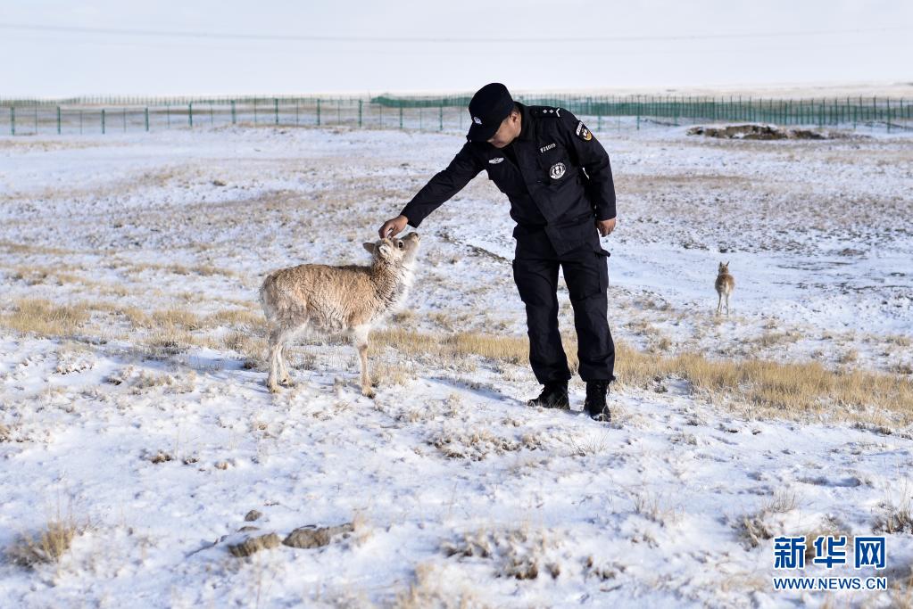 4月20日,袁廣明在可可西里藏羚羊救助站與被救助的藏羚羊在一起。新華社記者 吳剛 攝