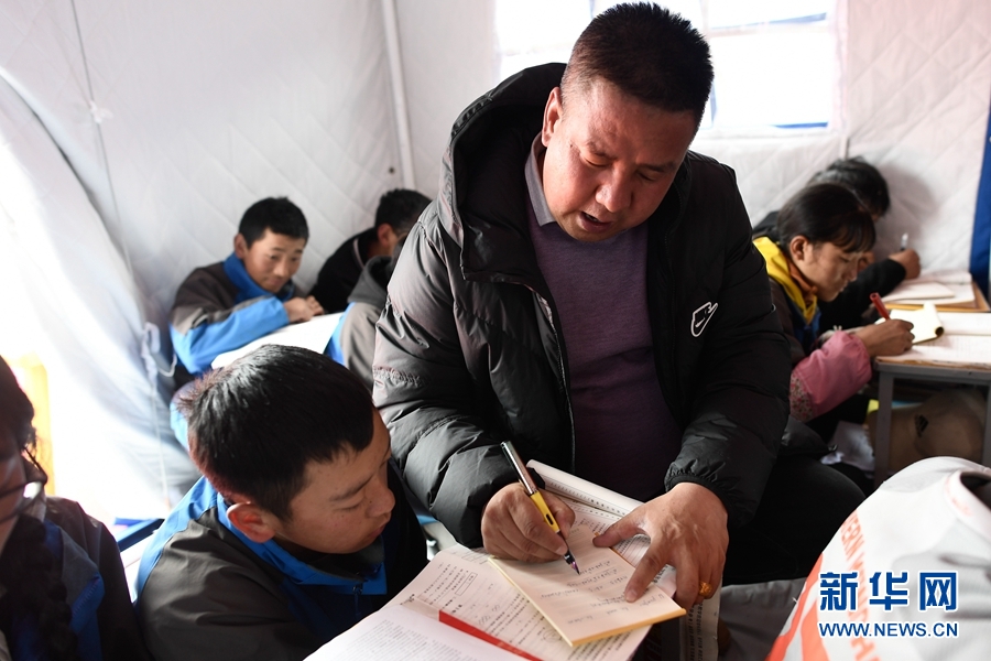 5月23日,瑪多縣民族寄宿制中學九年級老師李加才仁在課堂上輔導學生。新華社記者 張龍 攝