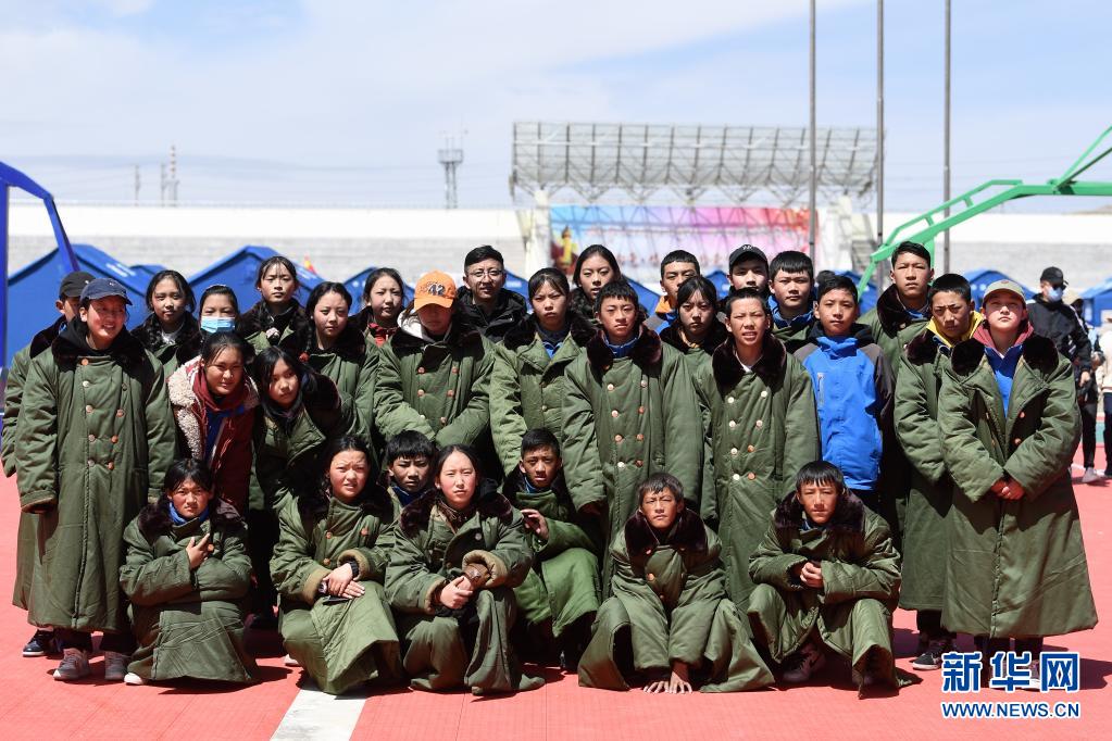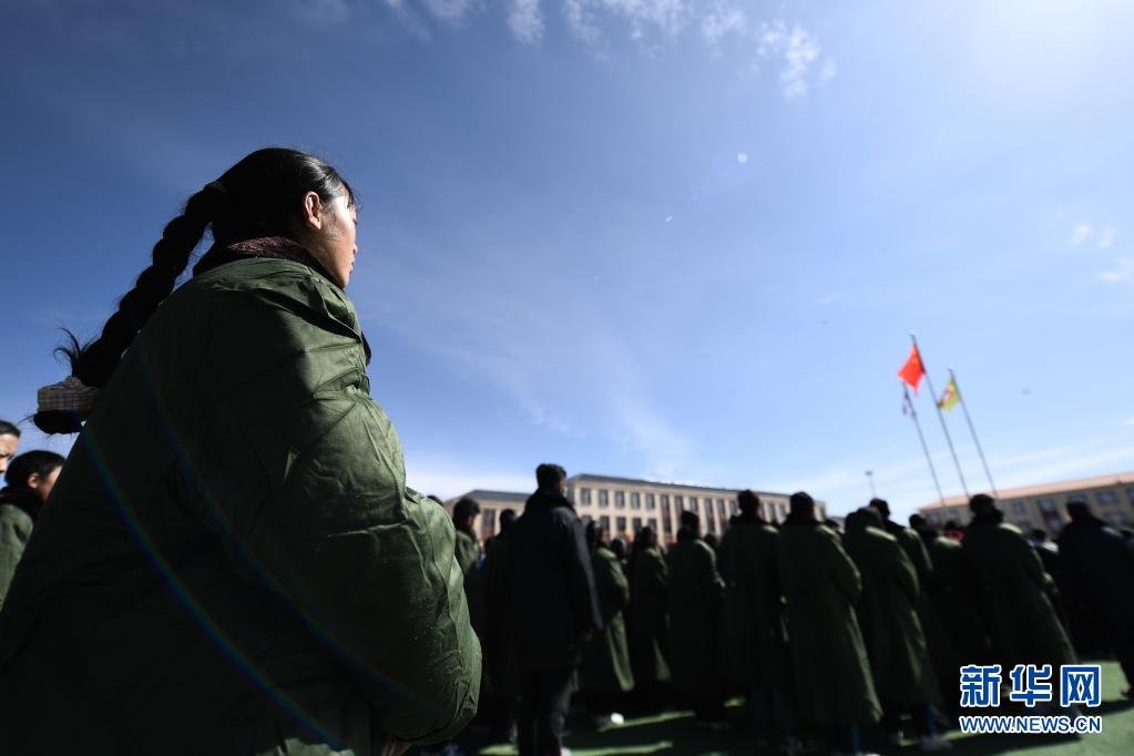 5月24日,曲邁卓瑪(左一)在瑪多縣民族寄宿制中學參加升旗儀式。新華社 張龍 攝