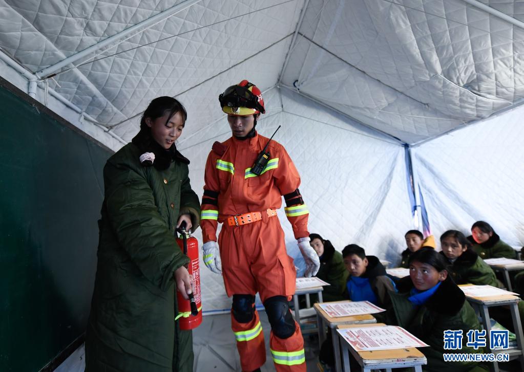 5月24日,青海果洛州消防救援支隊隊員在指導曲邁卓瑪(左一)學習防災避險知識。新華社 張龍 攝