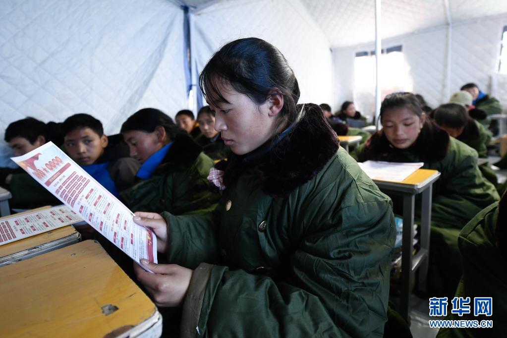 5月24日,曲邁卓瑪在瑪多縣民族寄宿制中學帳篷教室里學習防災避險知識。新華社 張龍 攝