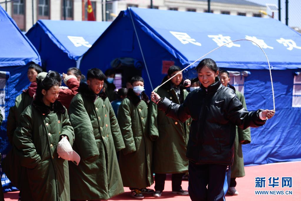 5月24日,曲邁卓瑪在課間與同學們一起跳繩。新華社 張龍 攝