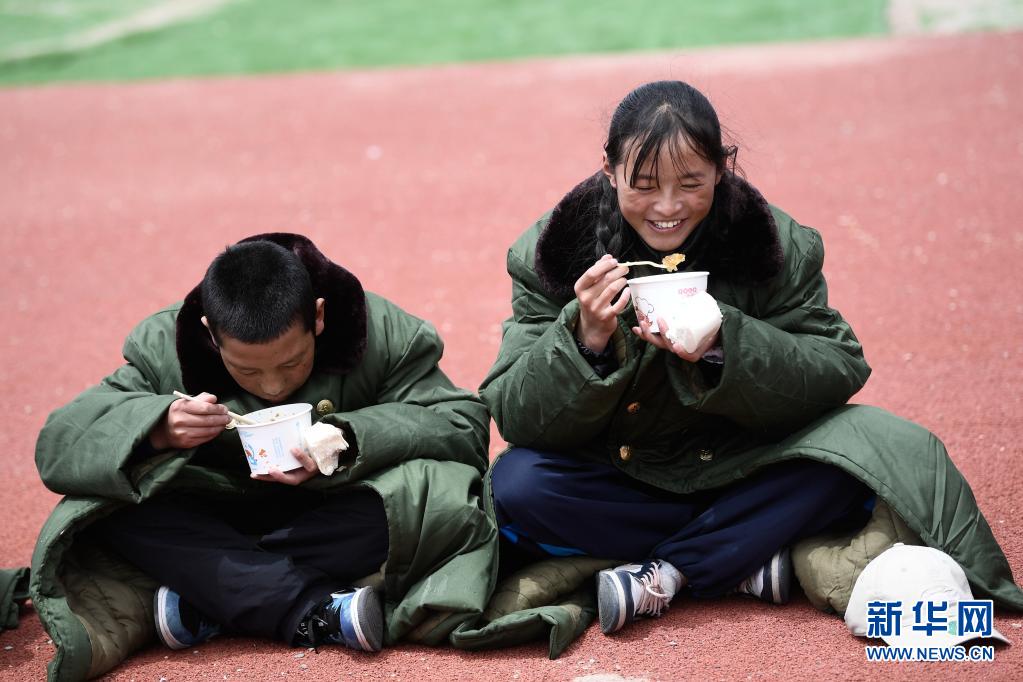5月24日,曲邁卓瑪(右)與同學在瑪多縣民族寄宿制中學吃午飯。新華社 張龍 攝