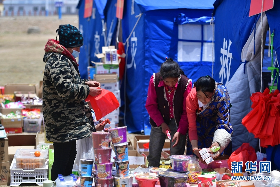 為穩(wěn)定市場(chǎng)秩序,方便居民生活,瑪多縣市場(chǎng)監(jiān)督管理局從5月23日開始,搭建臨時(shí)帳篷市場(chǎng),服務(wù)群眾。5月26日,兩名受災(zāi)群眾在瑪查理鎮(zhèn)安置點(diǎn)的帳篷超市選購商品。