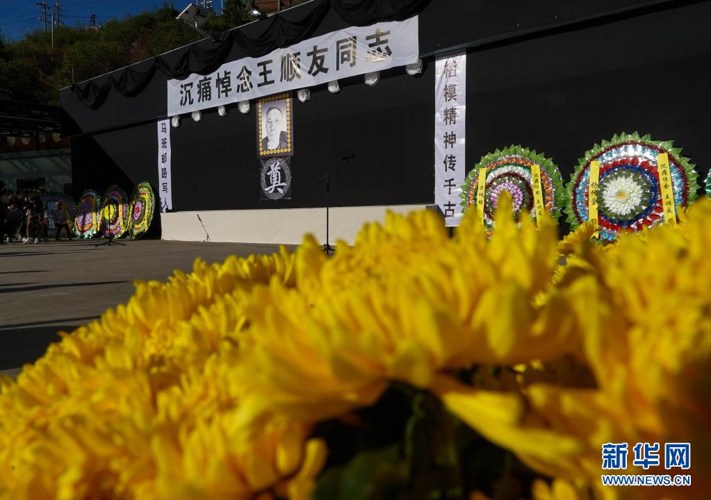 現(xiàn)場(chǎng)莊嚴(yán)肅穆、哀樂(lè)低回。廣場(chǎng)正中懸掛著遺像和黑底白字橫幅“沉痛悼念王順友同志”,挽聯(lián)寫著:馬班郵路寫人生,楷模精神傳千古。