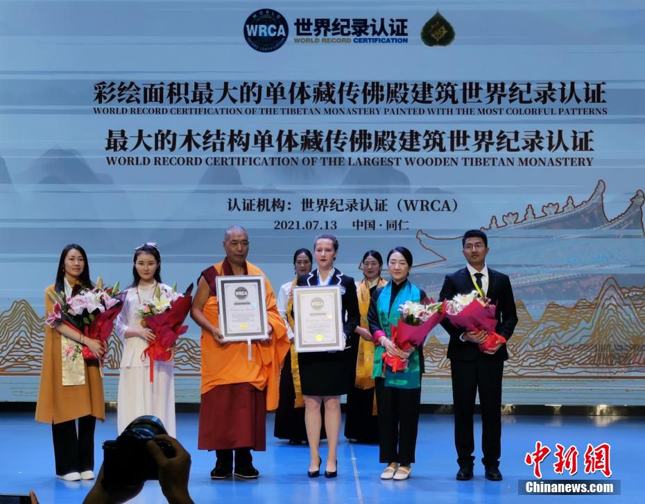 7月13日,青海省黃南藏族自治州同仁市麻巴寺新修建的扎西多卡瑪?shù)?3日正式落成,并被世界紀(jì)錄認(rèn)證機(jī)構(gòu)(WRCA)認(rèn)證為彩繪面積最大的單體藏傳佛殿建筑和最大的木結(jié)構(gòu)單體藏傳佛殿建筑。據(jù)悉,新修建的扎西多卡瑪?shù)睿ㄗ诳Π偷睿﹥?nèi)外均以礦石原料和植物原料手工彩繪,面積為5883.48平方米,該殿被確認(rèn)為“世界彩繪面積最大的單體藏傳佛殿建筑”,該殿主體為木制結(jié)構(gòu)的重檐歇山頂式建筑,占地面積為540余平方米,長(zhǎng)27米、寬21米、高16米,共三層,該殿被確認(rèn)為“世界最大的木結(jié)構(gòu)單體藏傳佛殿建筑”。