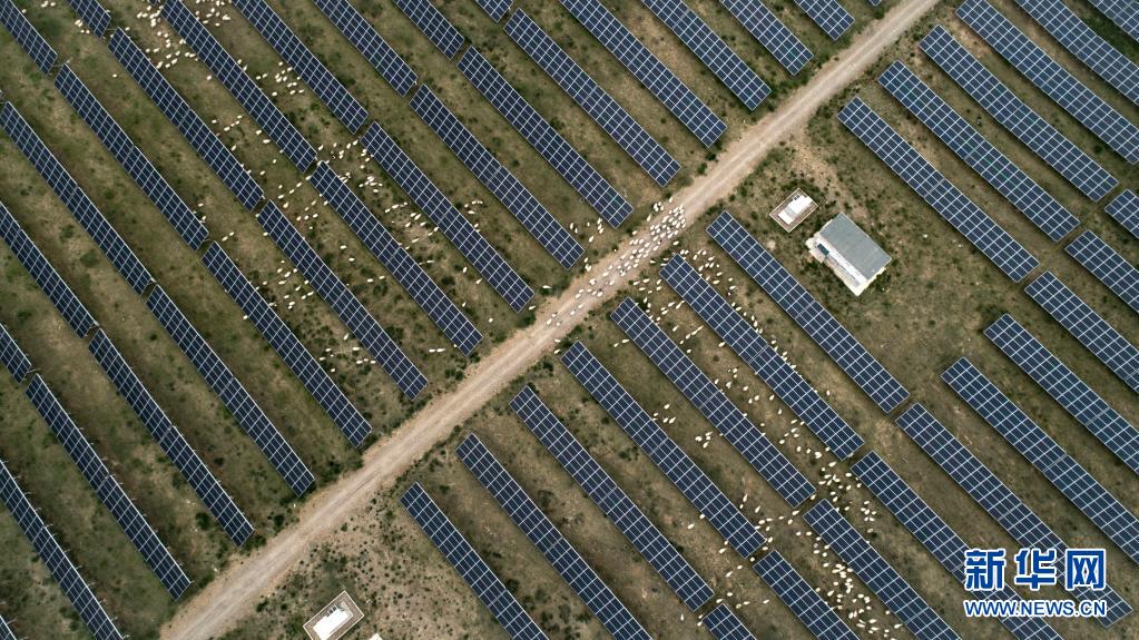 羊群在青海省海南藏族自治州共和縣光伏產(chǎn)業(yè)園吃草(2019年6月16日攝,無人機照片)。新華社 吳剛 攝