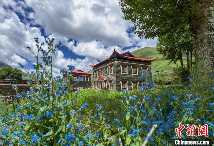 藏式民居旁盛開的小藍花。劉忠俊 攝