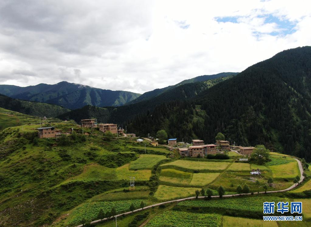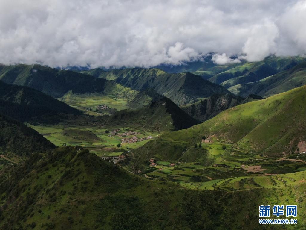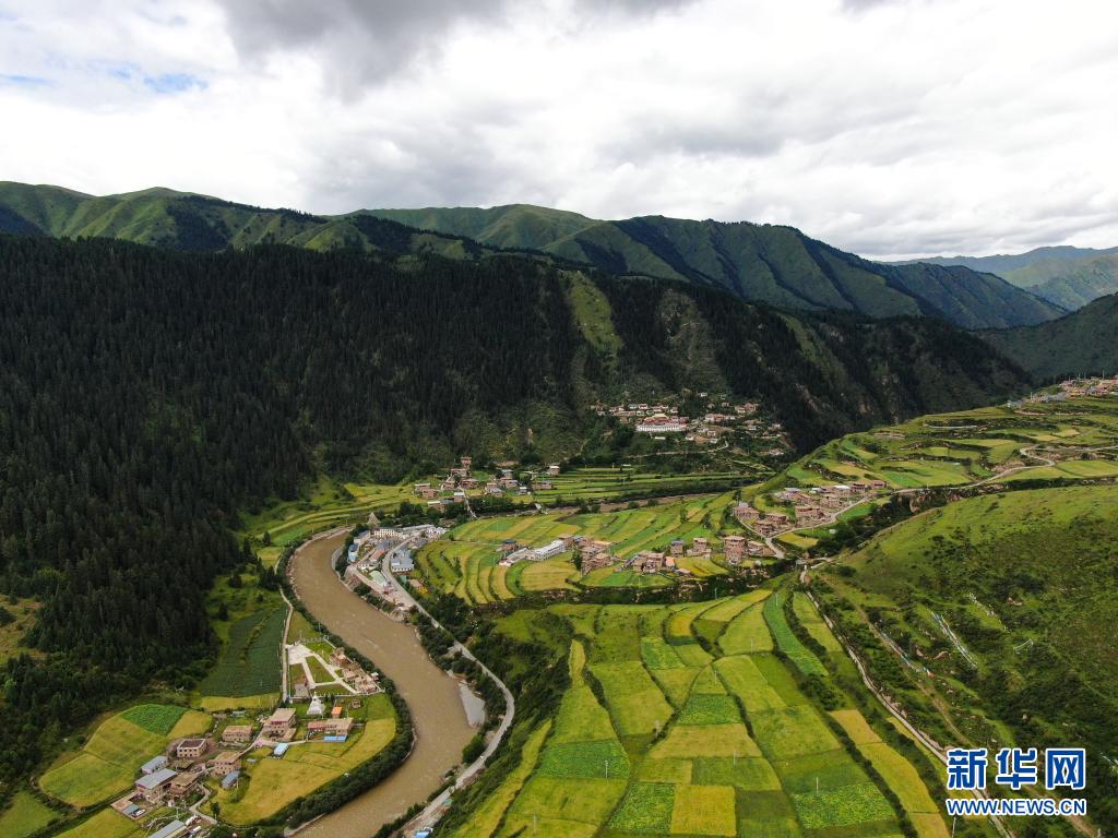 8月7日在青海省果洛藏族自治州班瑪縣境內(nèi)拍攝的村莊景色(無人機照片)。新華社記者 張龍 攝