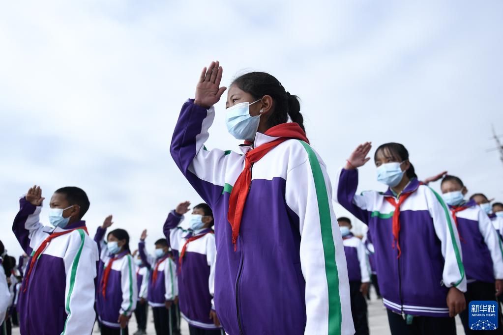 9月1日,在位于果洛藏族自治州瑪沁縣的瑪多地震災(zāi)后過渡安置一校區(qū),學(xué)生參加升旗儀式。新華社記者 張龍 攝