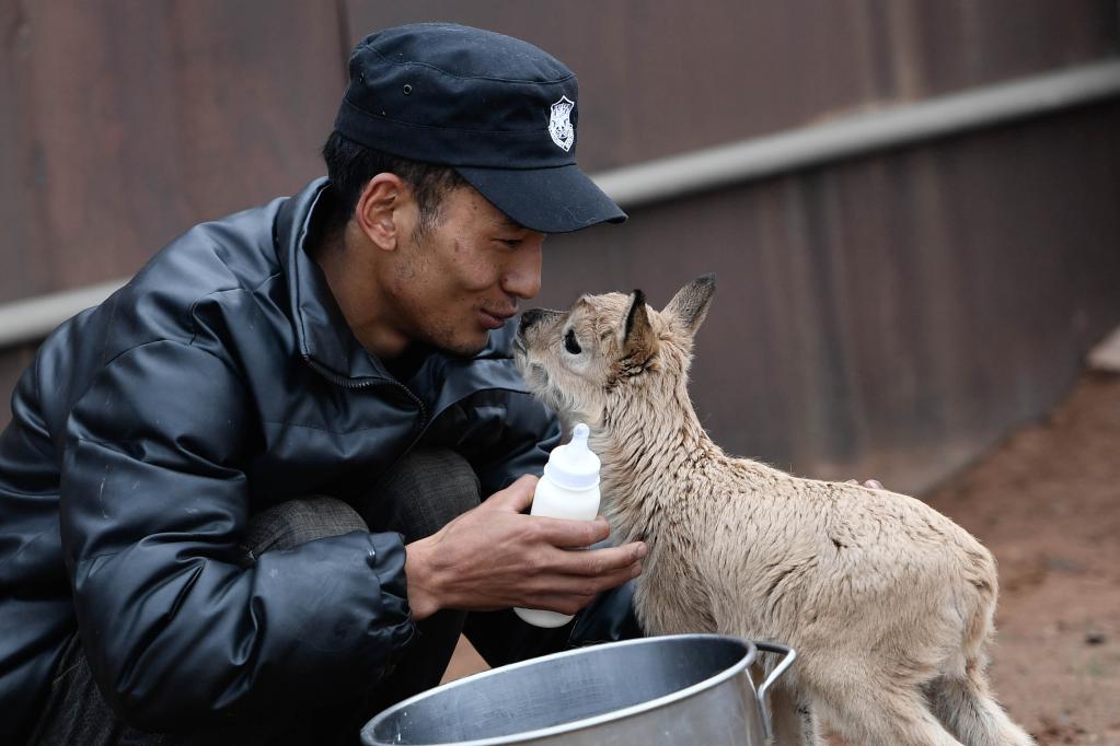 在可可西里索南達杰保護站,修建了野生動物救助中心。巡山隊員們義務(wù)當起“奶爸”,照顧著與羊群走失、失去“媽媽”的藏羚羊幼仔。