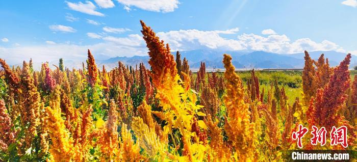 河西農(nóng)場(chǎng)農(nóng)民劉旦智種了30畝藜麥,紅色、白色、黑色的藜麥,在藍(lán)天白云的映襯下,勾勒出一幅高原秋收的美景圖?!敖衲贽见滈L(zhǎng)勢(shì)不錯(cuò),一畝地大約600多斤,如果每斤按4塊錢算,一畝地可以收入3000多塊錢,經(jīng)濟(jì)效益很不錯(cuò)。我還種了40多畝枸杞,長(zhǎng)勢(shì)跟去年差不多,1斤能賣20多塊錢?!眲⒌┲歉吲d地給記者算著賬。